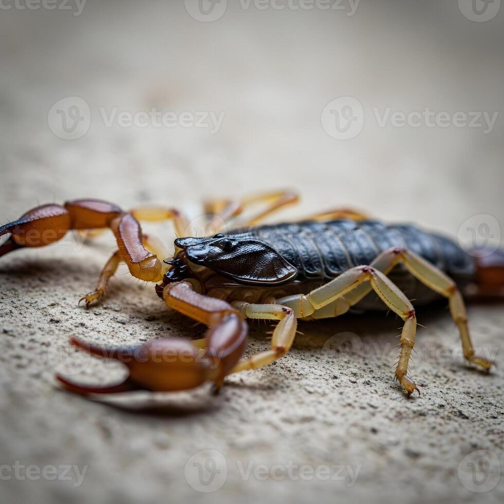 Intricate Macro Photograph of a Scorpion Resting on a Textured Surface, Highlighted by Delicate Ambient Light and Natural Organic Patterns Pro Photo