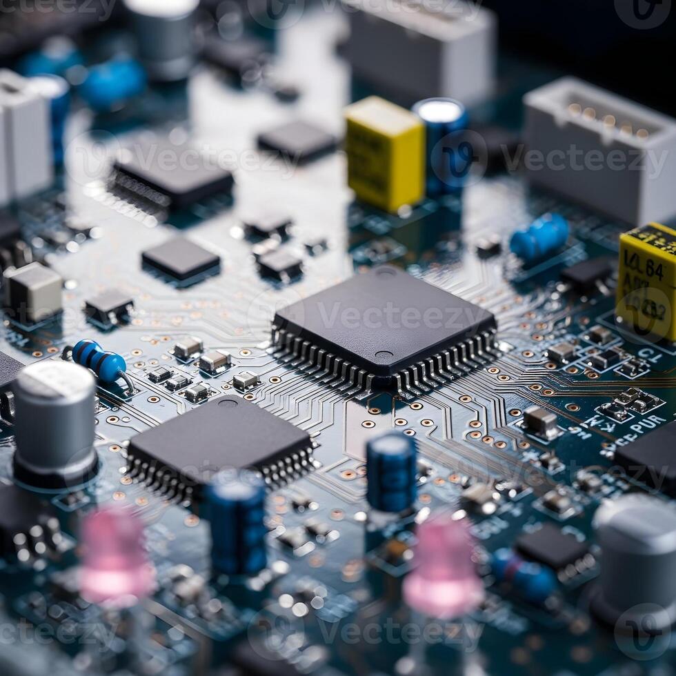 Intricate Macro Capture of a Shimmering Electronic Circuit Board with Reflective Metallic Textures, Ambient Lighting, and Vibrant Color Accents Excellence Pro Photo