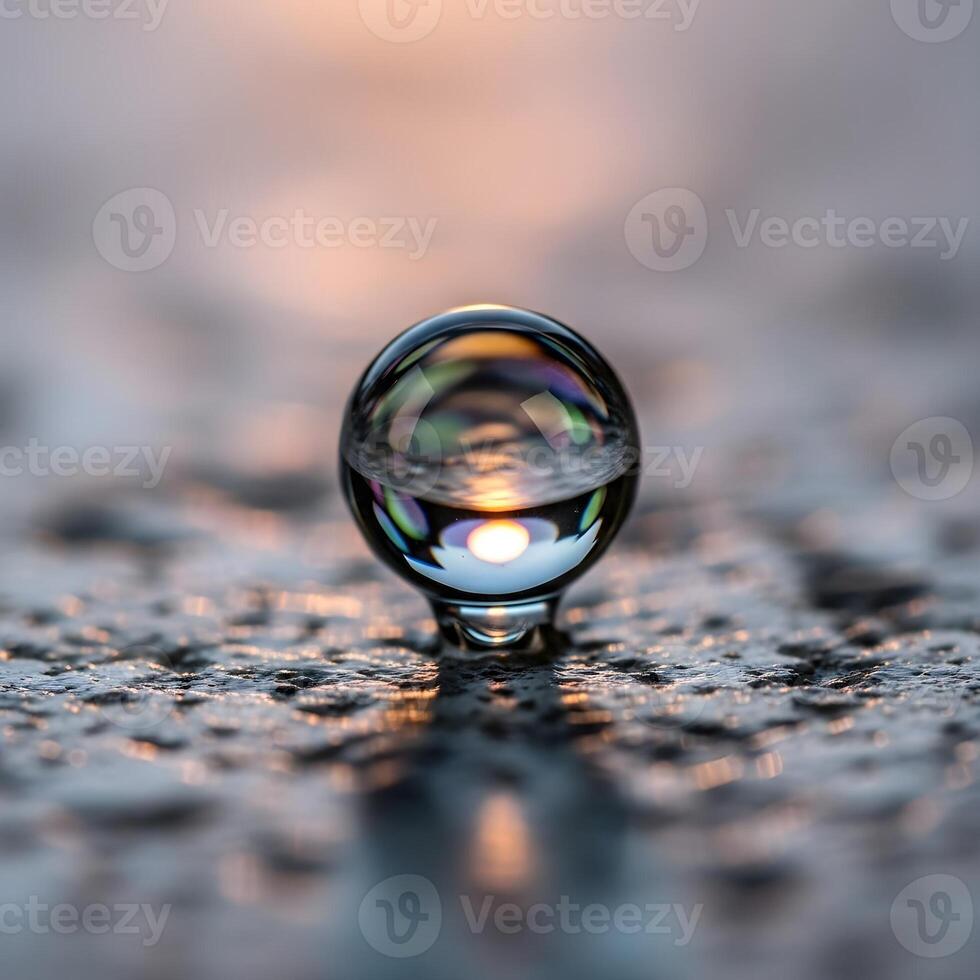 A mesmerizing macro exploration of a minuscule metallic droplet shrinking gracefully on a textured surface, reflecting surreal ambient light patterns Pro Photo