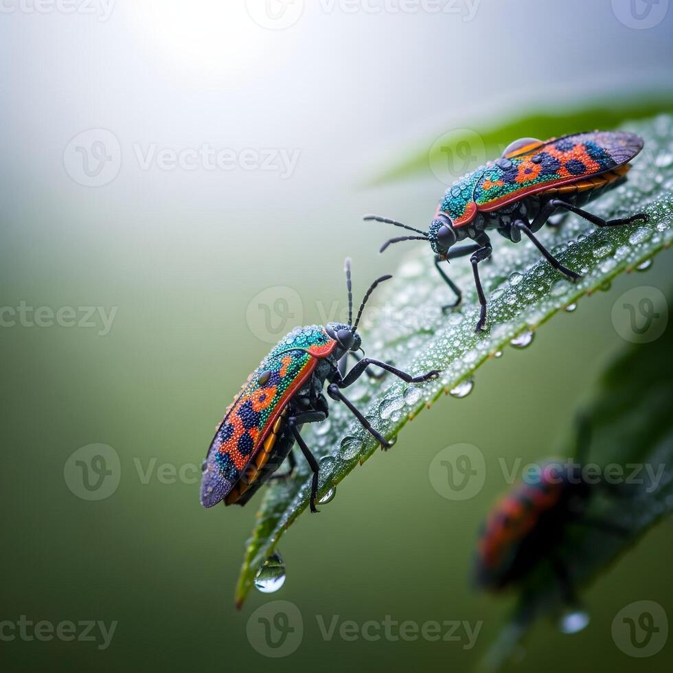 Macro Revelations A Captivating Close-Up of Luminous Insects on Dew-Encrusted Leaves Embraced by Diffused, Ethereal Light and Rich Intricate Textures Pro Photo