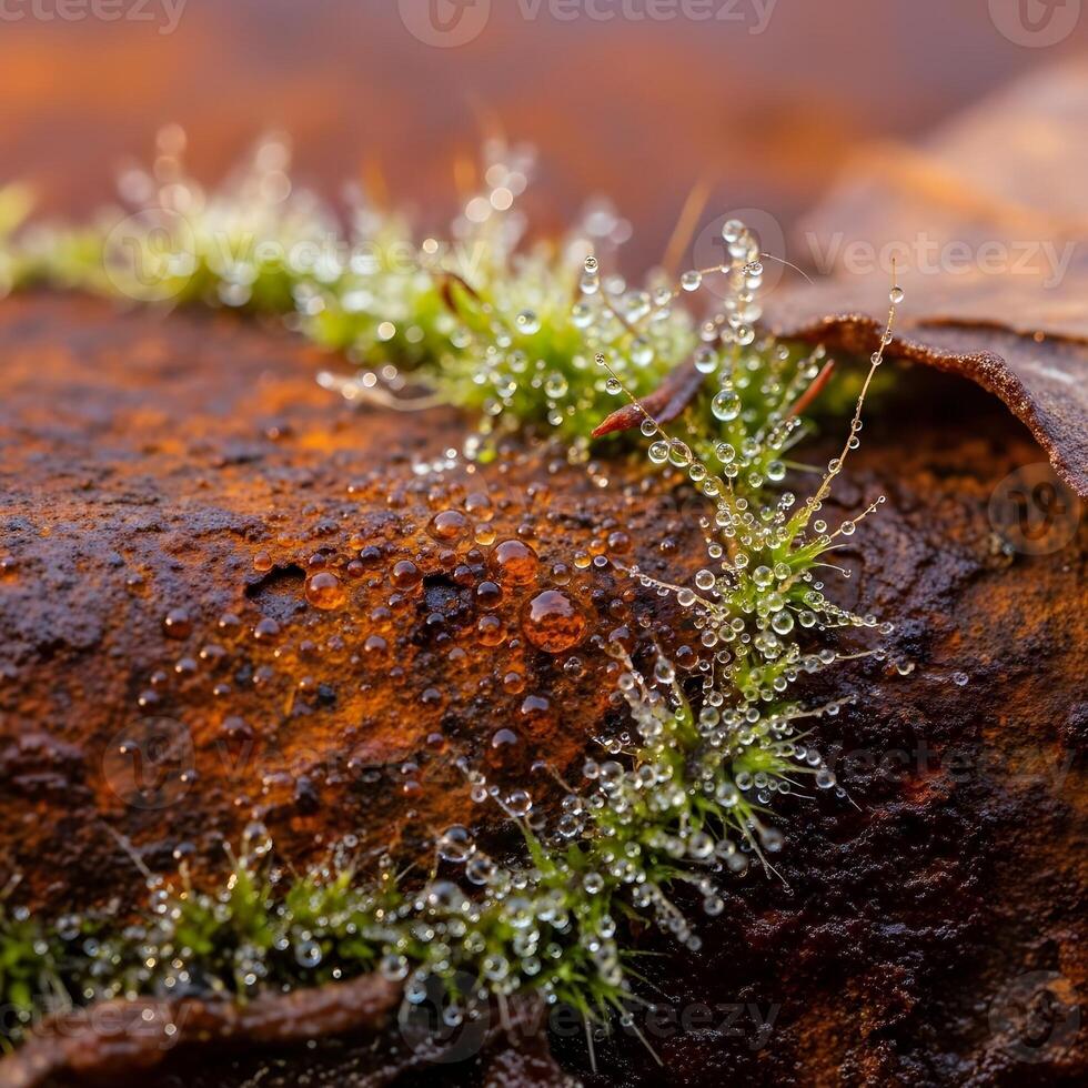 Close-Up Encounter An Enchanting Display of Dew-laden Rust Merging with Organic Textures, Illuminated by the Subtle Dance of Natural Light Pro Photo