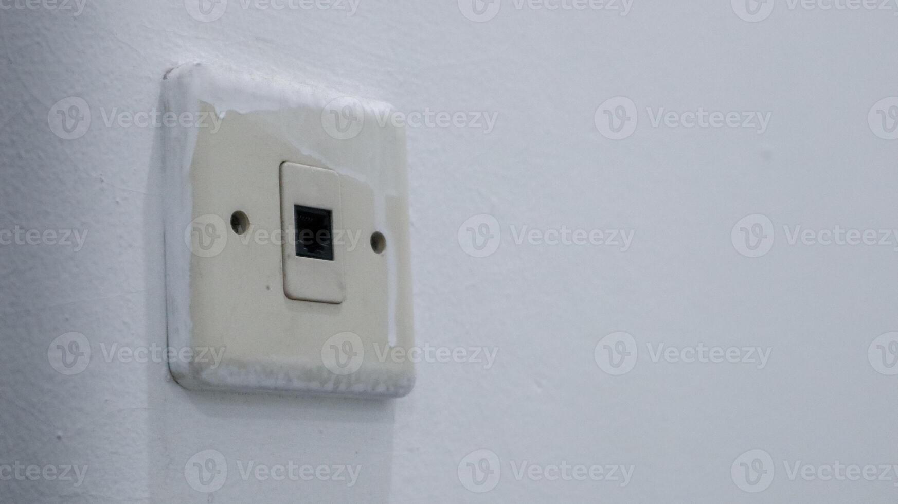 An aged and slightly grimy internet data port, showing wear and tear on a simple, textured white wall, symbolizing dated connectivity Pro Photo