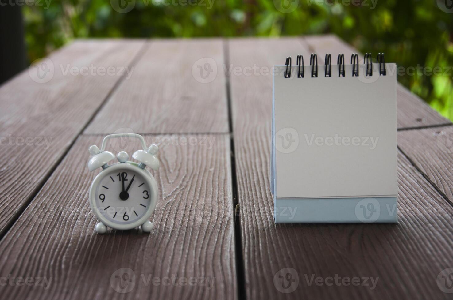 Alarm clock pointing at 1 o'clock with blank notepad on a bench. Copy space concept Pro Photo