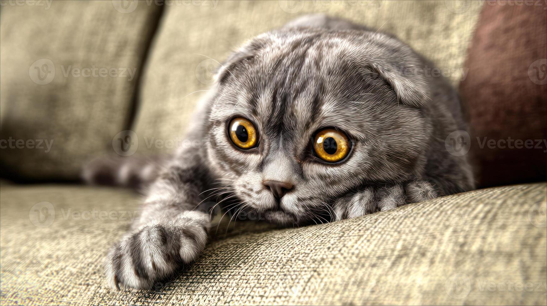 Curious cat with striking eyes resting on a soft textured surface Pro Photo