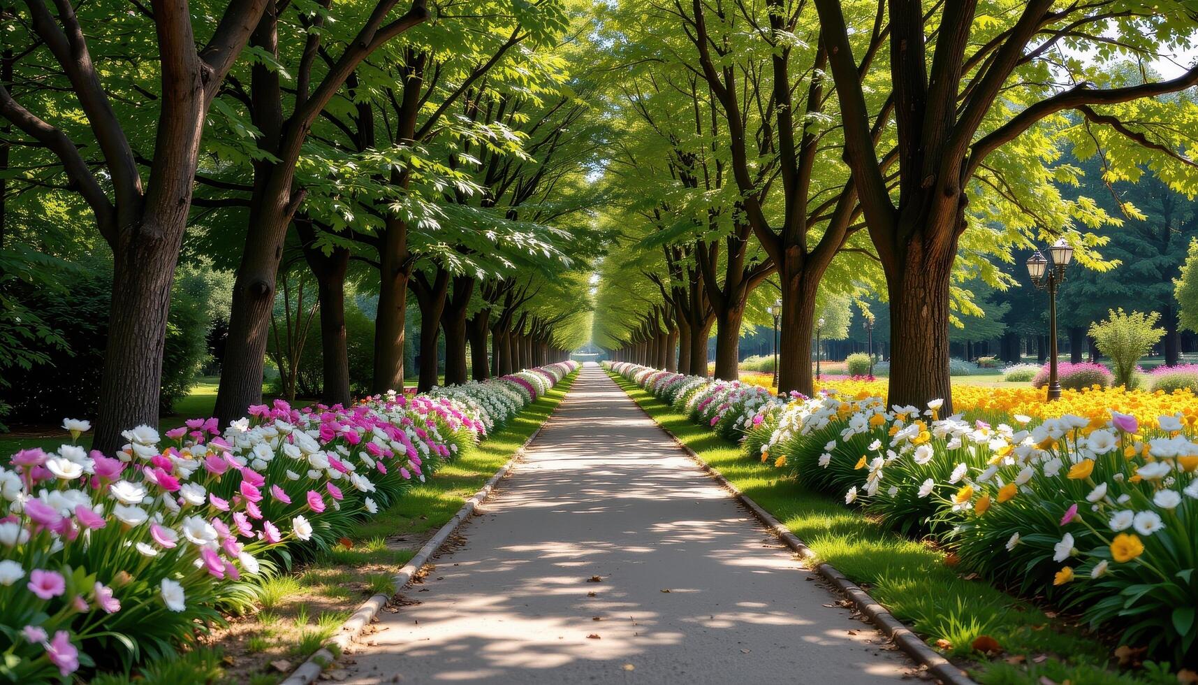 a peaceful flower filled path through tall, leafy trees, soft light casting shadows, completely empty space. Free Photo