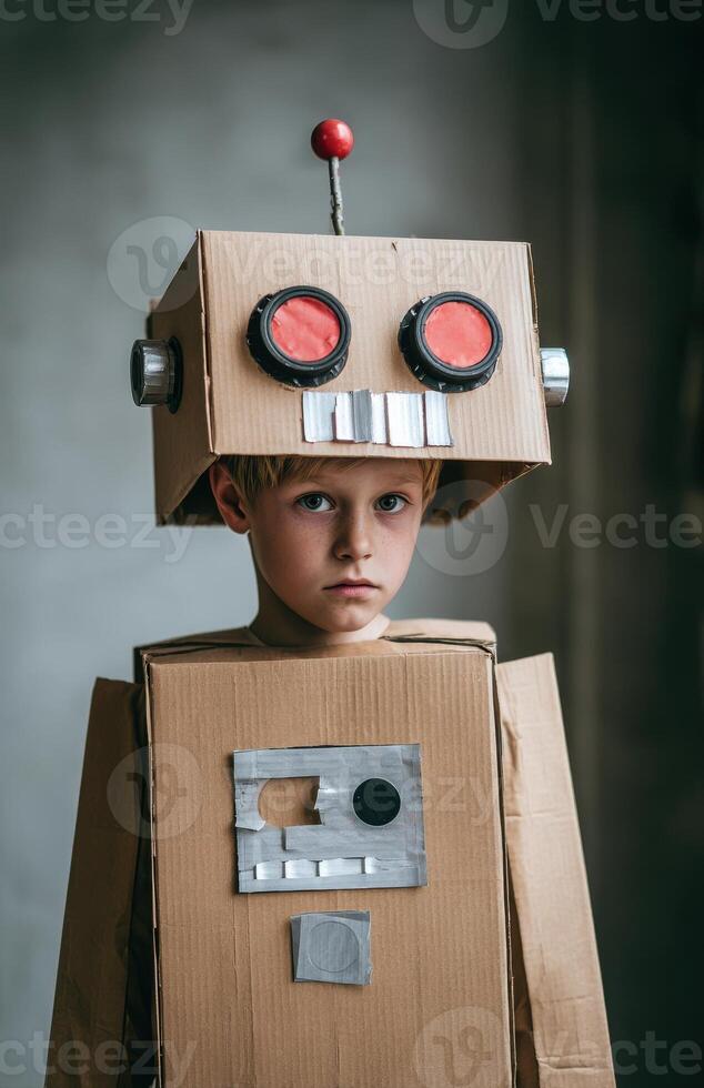 Child with cardboard robot costume creating imagination Pro Photo