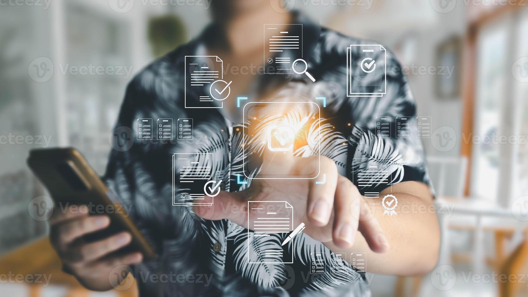 A man uses his finger to touch a virtual screen, selecting a checkmark icon. This action signifies the approval of electronic documents in a modern digital workflow and quality assurance process. Pro Photo