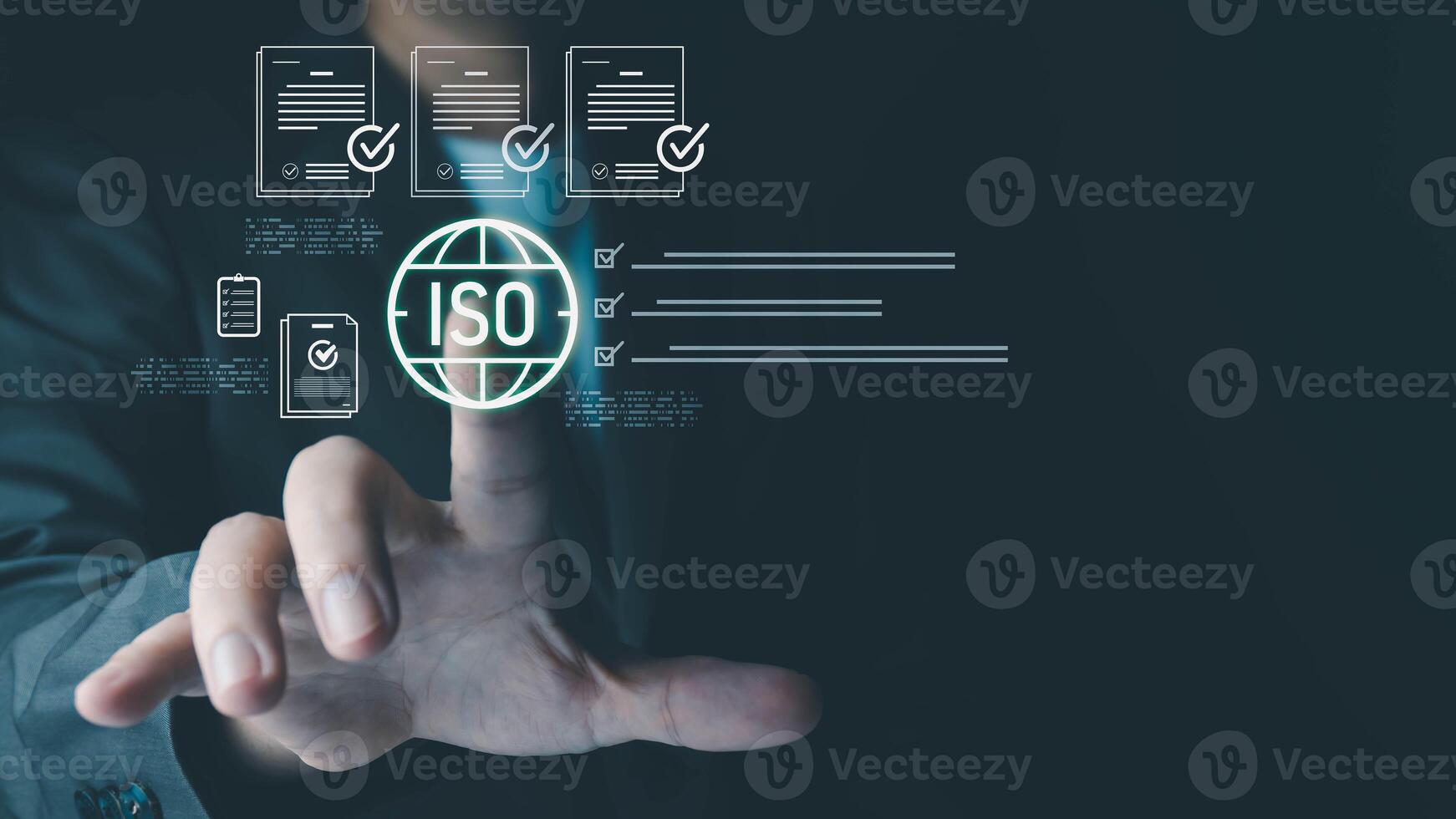 A person in a suit interacts with a glowing ISO icon surrounded by digital documents and checkboxes symbolizing quality management and certification Pro Photo