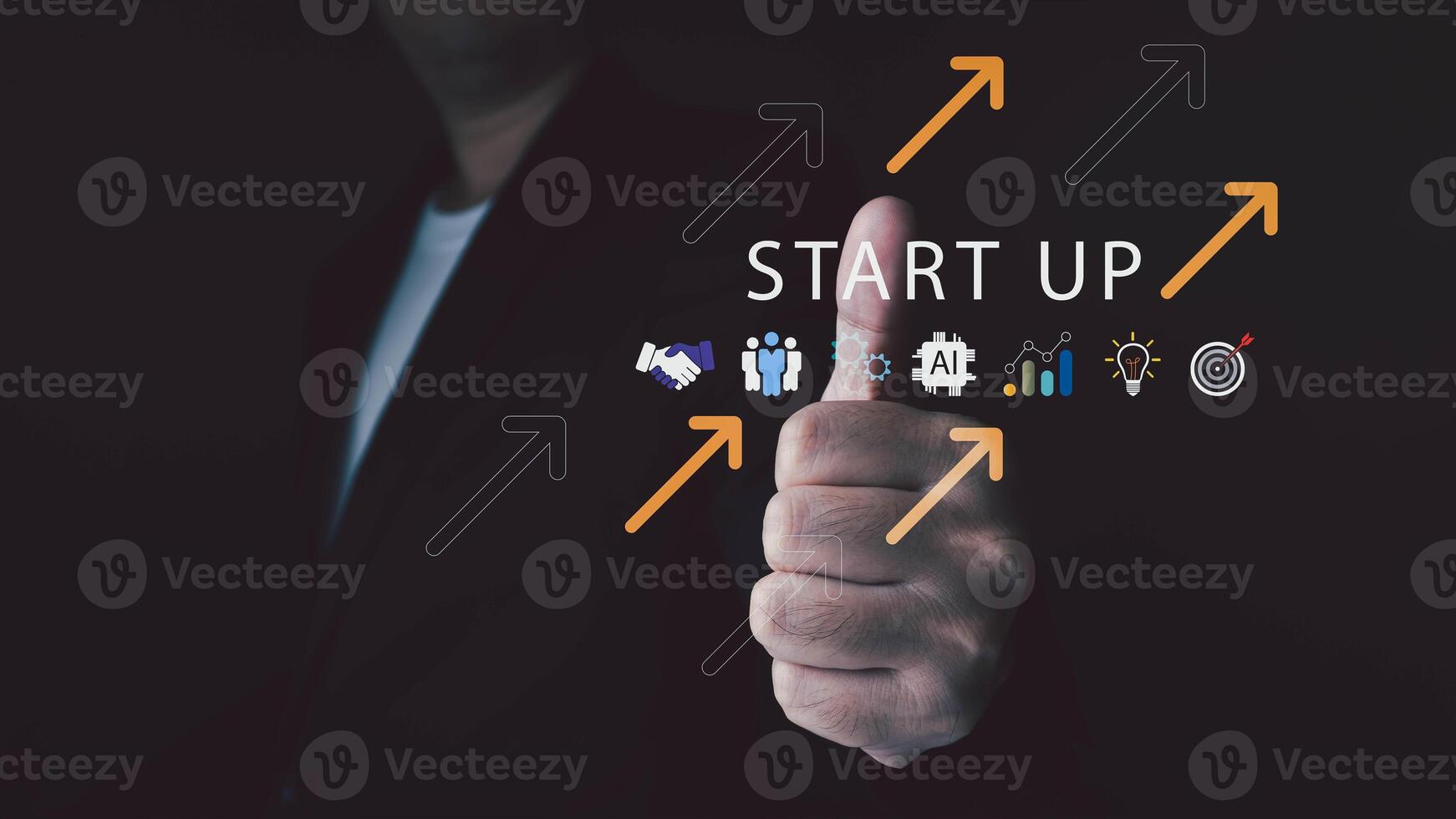 A man in a suit shows a thumbs up to a futuristic display with START UP text and business icons like AI and analytics symbolizing a new venture and success. Pro Photo
