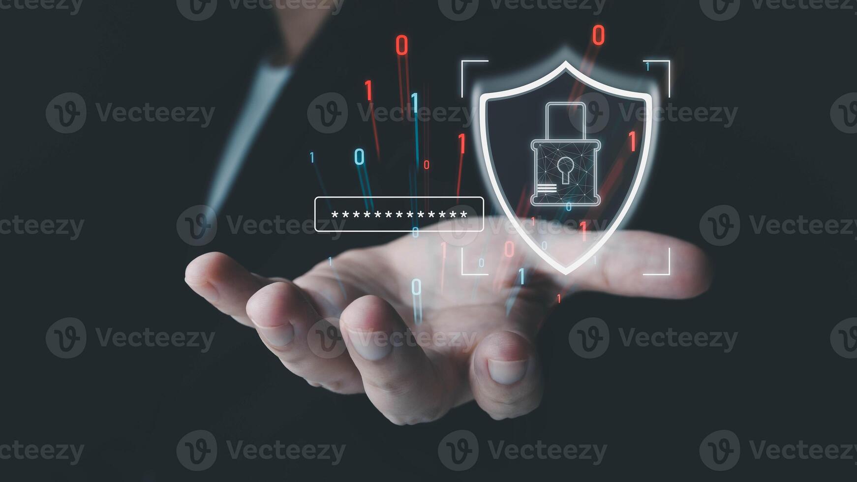 A person holds a glowing digital shield and lock icon, symbolizing cybersecurity and data protection with a password prompt over their hand on a dark background. Pro Photo