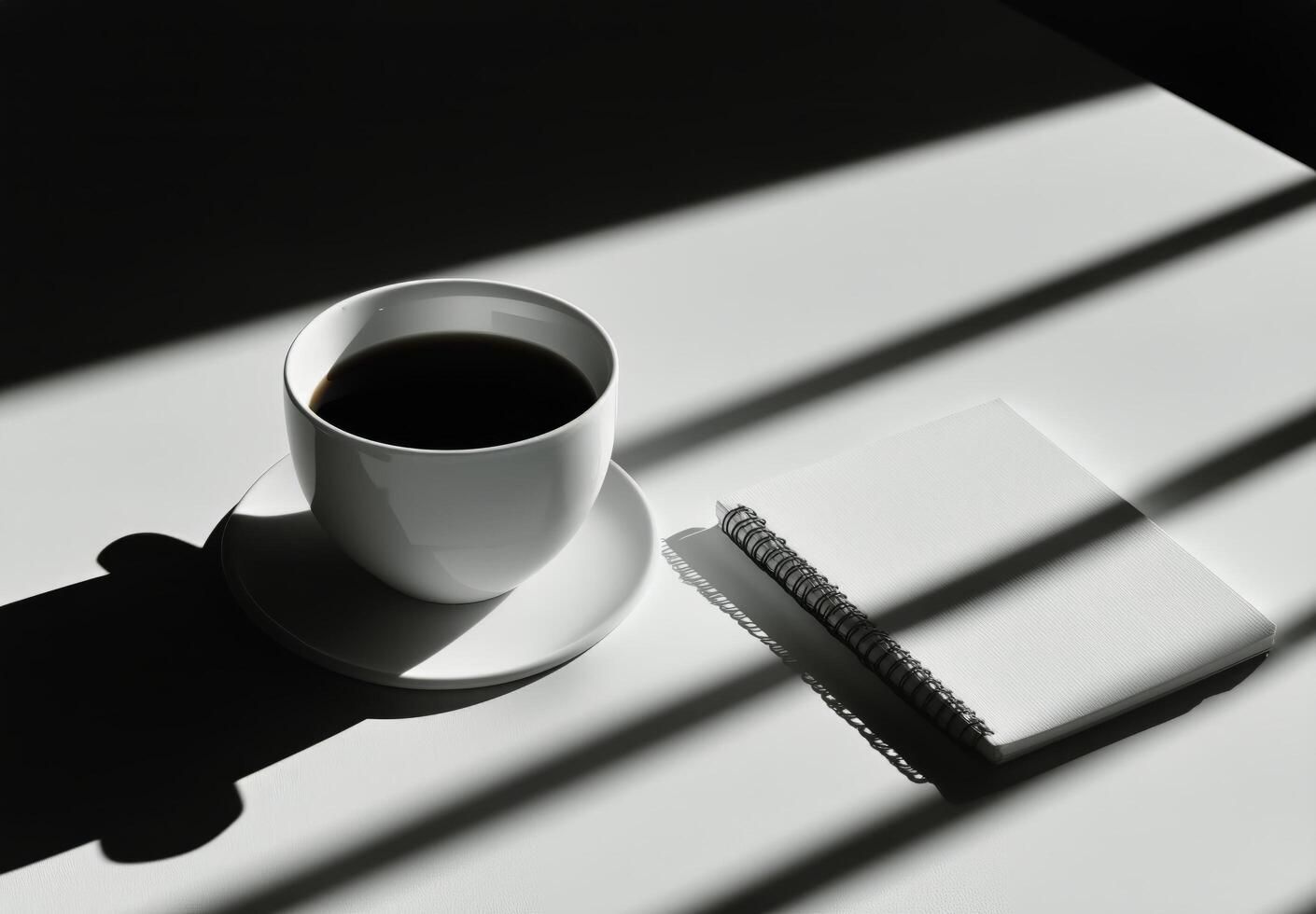 Coffee Cup and Notepad on a Table With Soft Shadows in a Minimalistic Room Setting. photo
