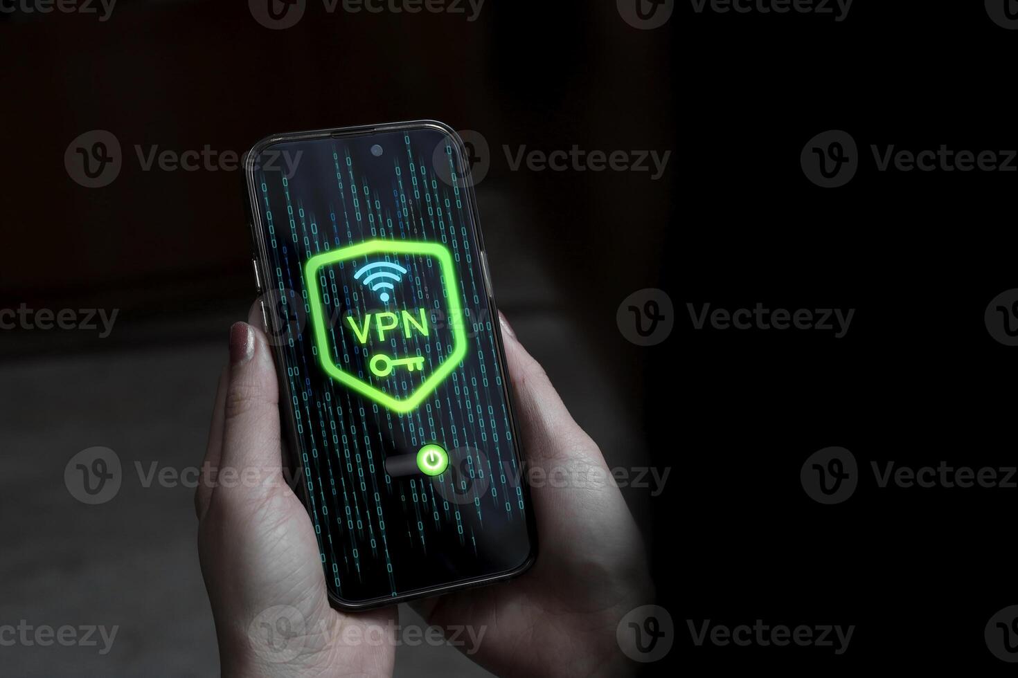 Activation of Virtual Private Network. Smartphone screen showing connect to VPN system. Concept of technology for connecting private network to public internet to hide user's IP address and security. Pro Photo