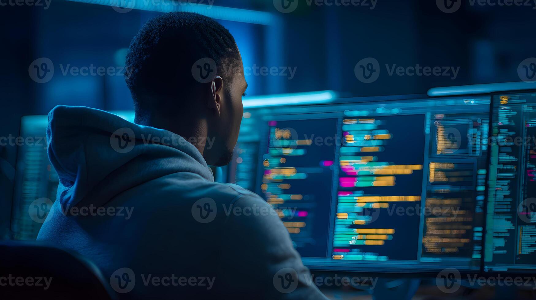 African American man coding on multiple screens in a dimly lit workspace with vibrant data display Pro Photo