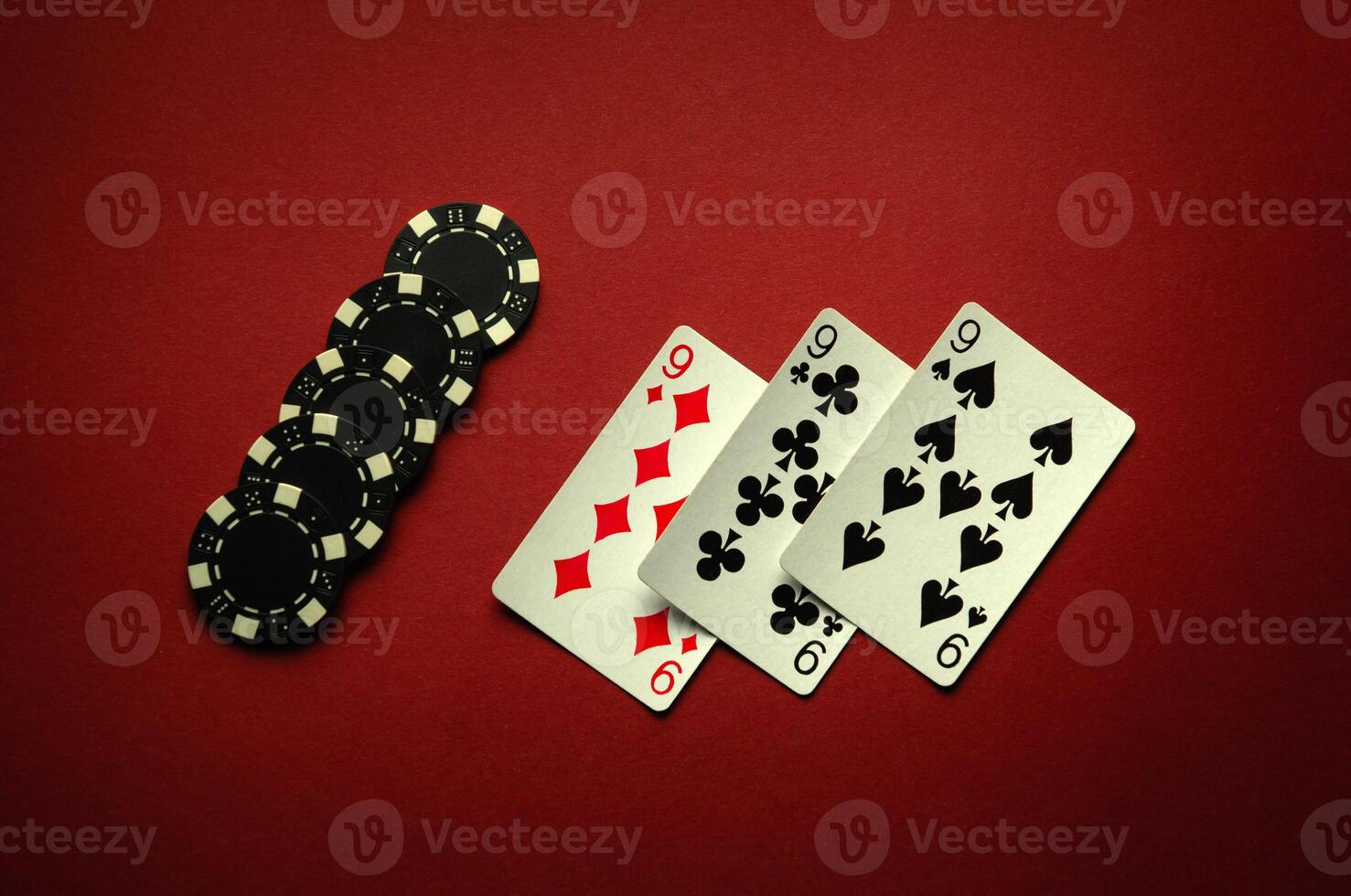 Big luck in a card game of poker with a winning combination of three of a kind or set. Playing cards and chips are laid out in a club on a red table Pro Photo