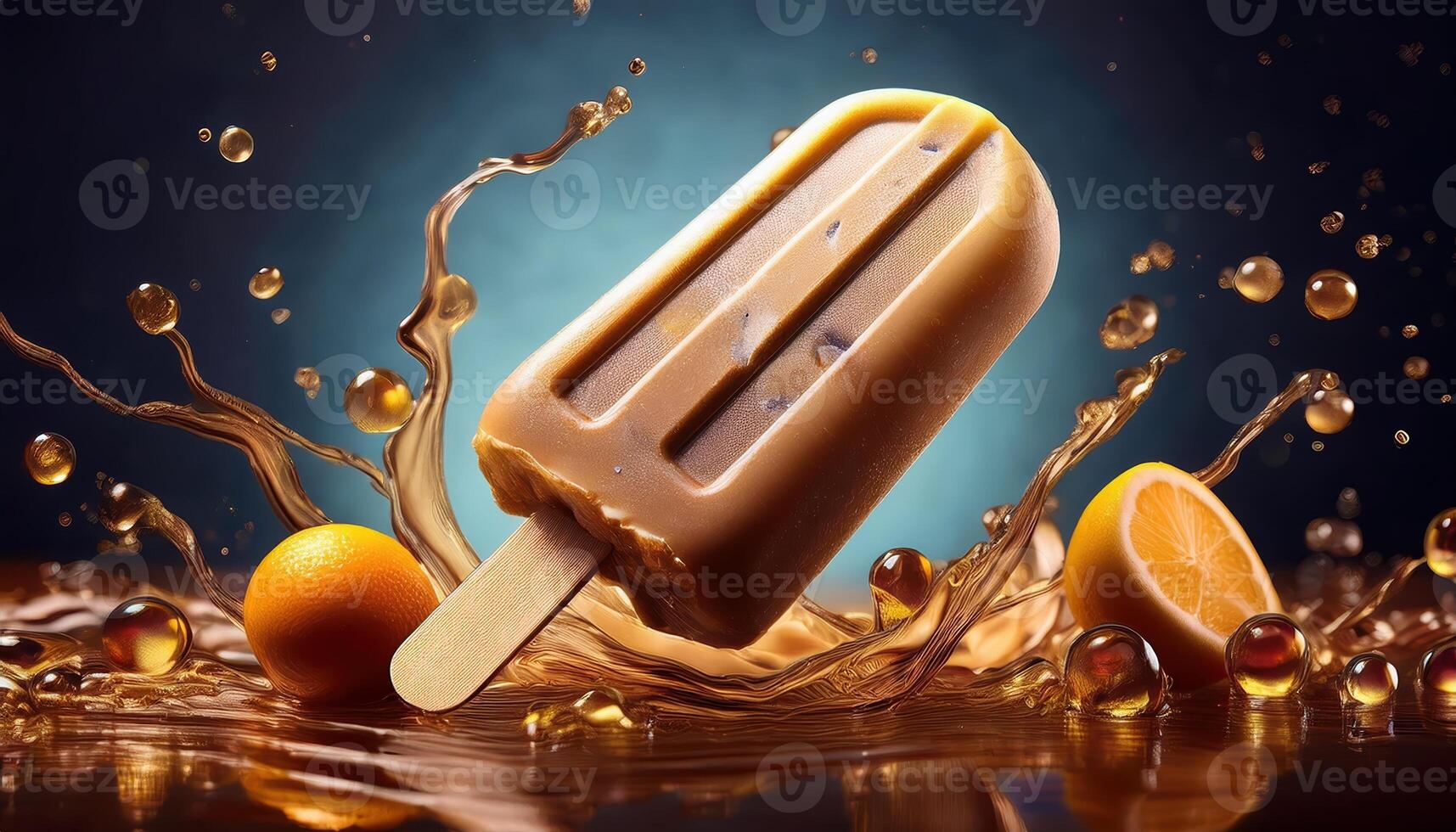 Vibrant advertisement showcasing a brown resin pattern with marbled texture, emphasizing a refreshing treat in a dynamic splash Pro Photo