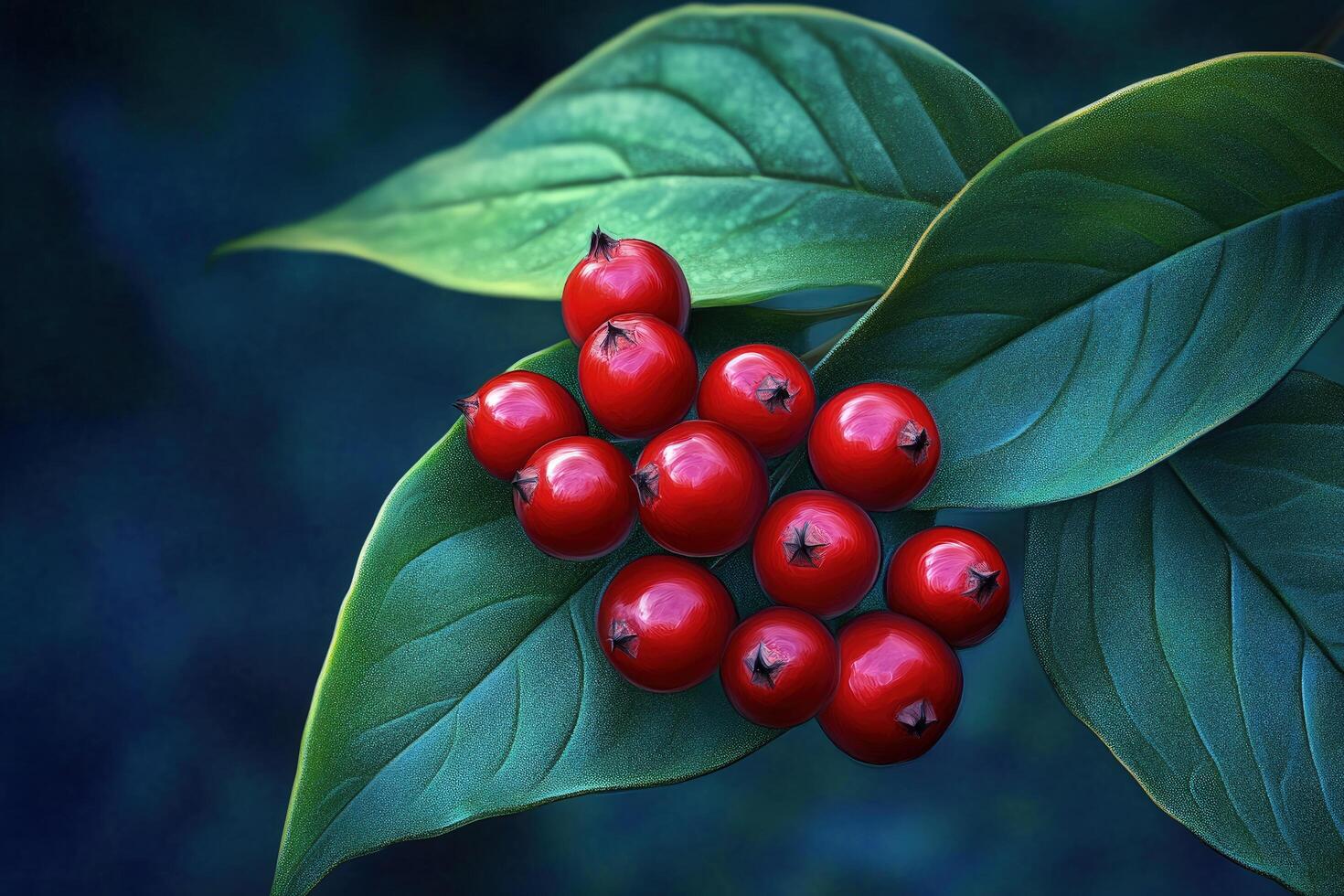 Glossy leaves support clusters of bright red berries, creating a captivating natural display and artistic pattern photo