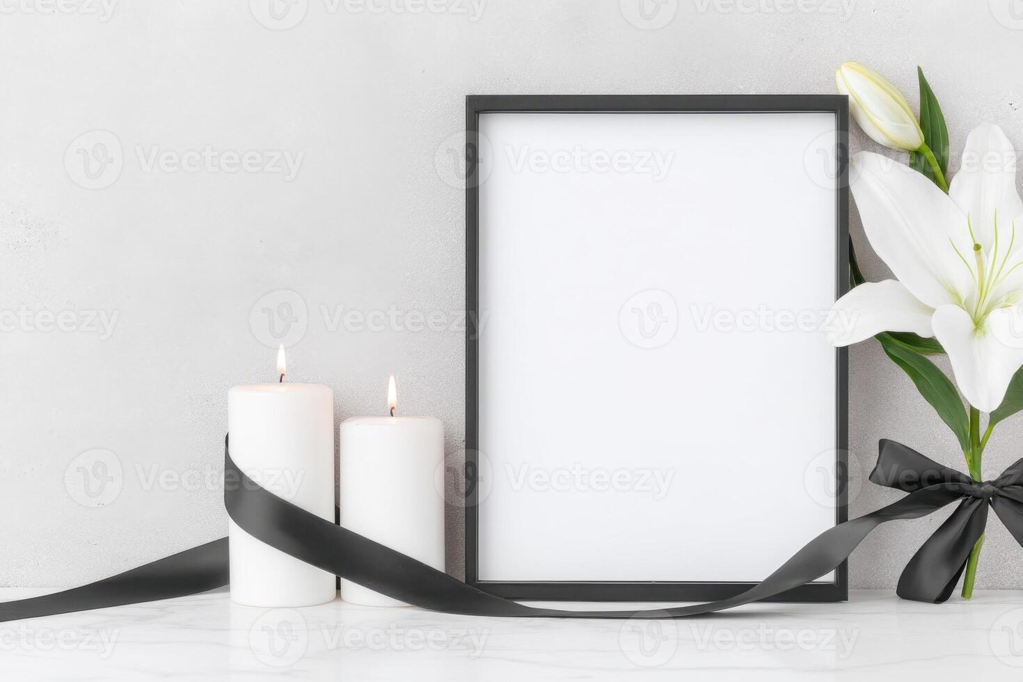 Elegant minimalistic funeral frame display with candles and lily flower in a respectful setting Pro Photo