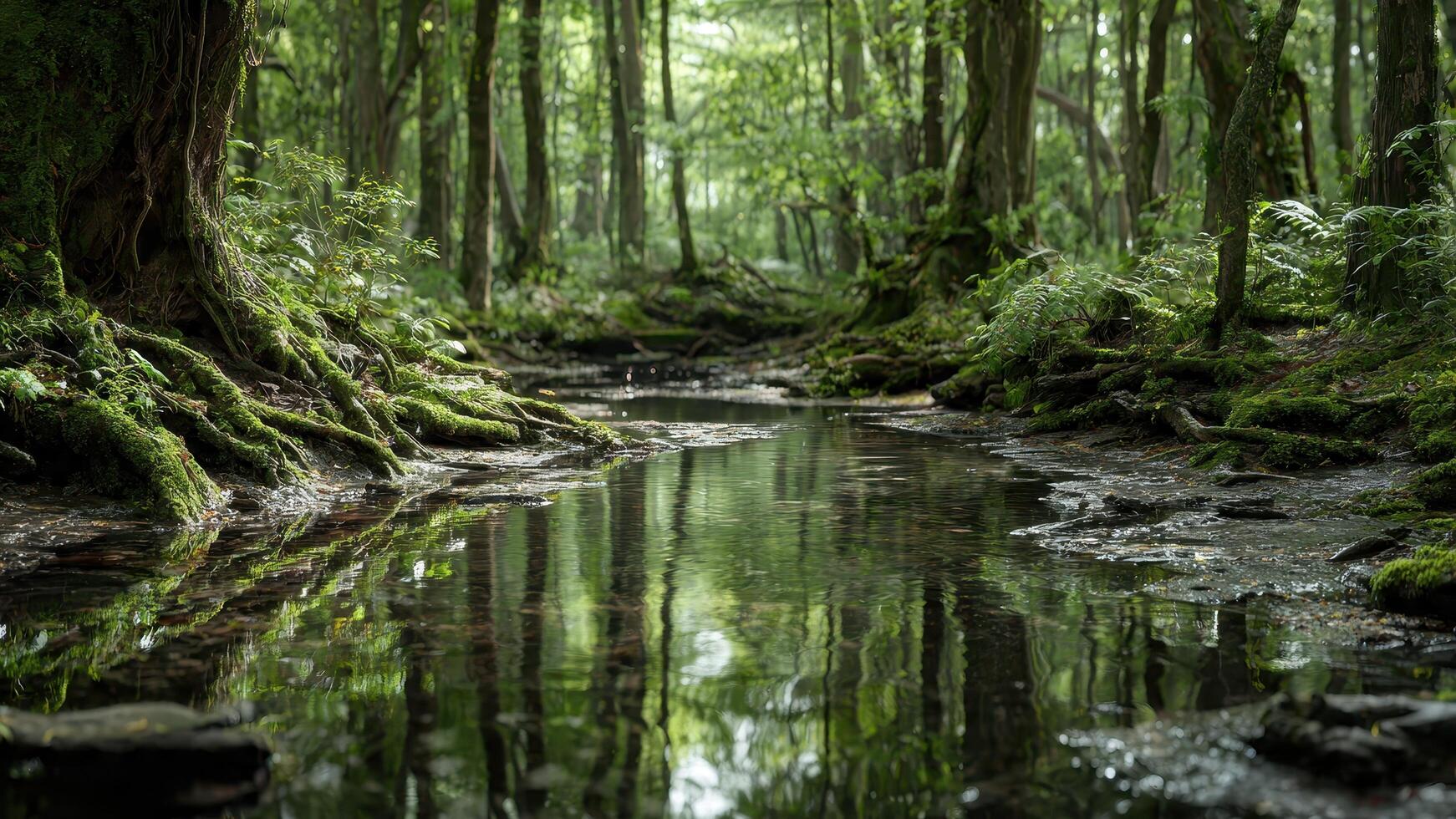 Serene shallow stream with moss covered trees and roots in a dense forest photo