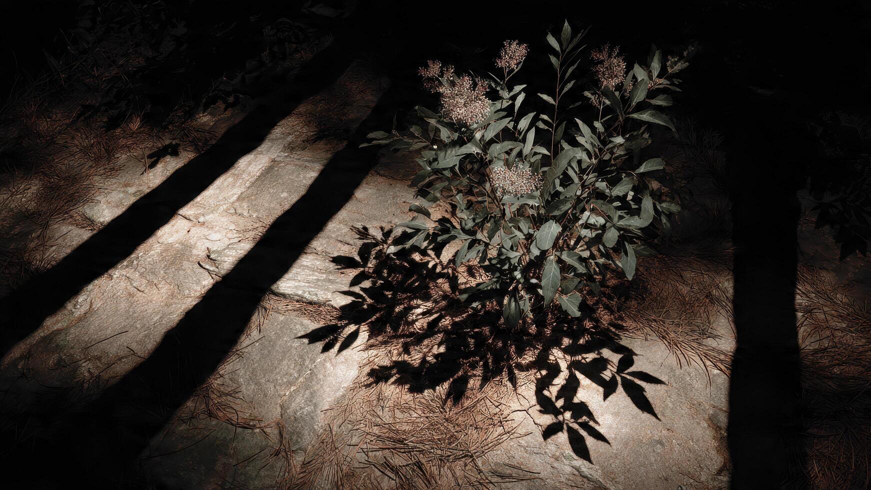 Sparse green plant with small flowers grows on rocky ground with pine needles dappled with shadow patterns photo