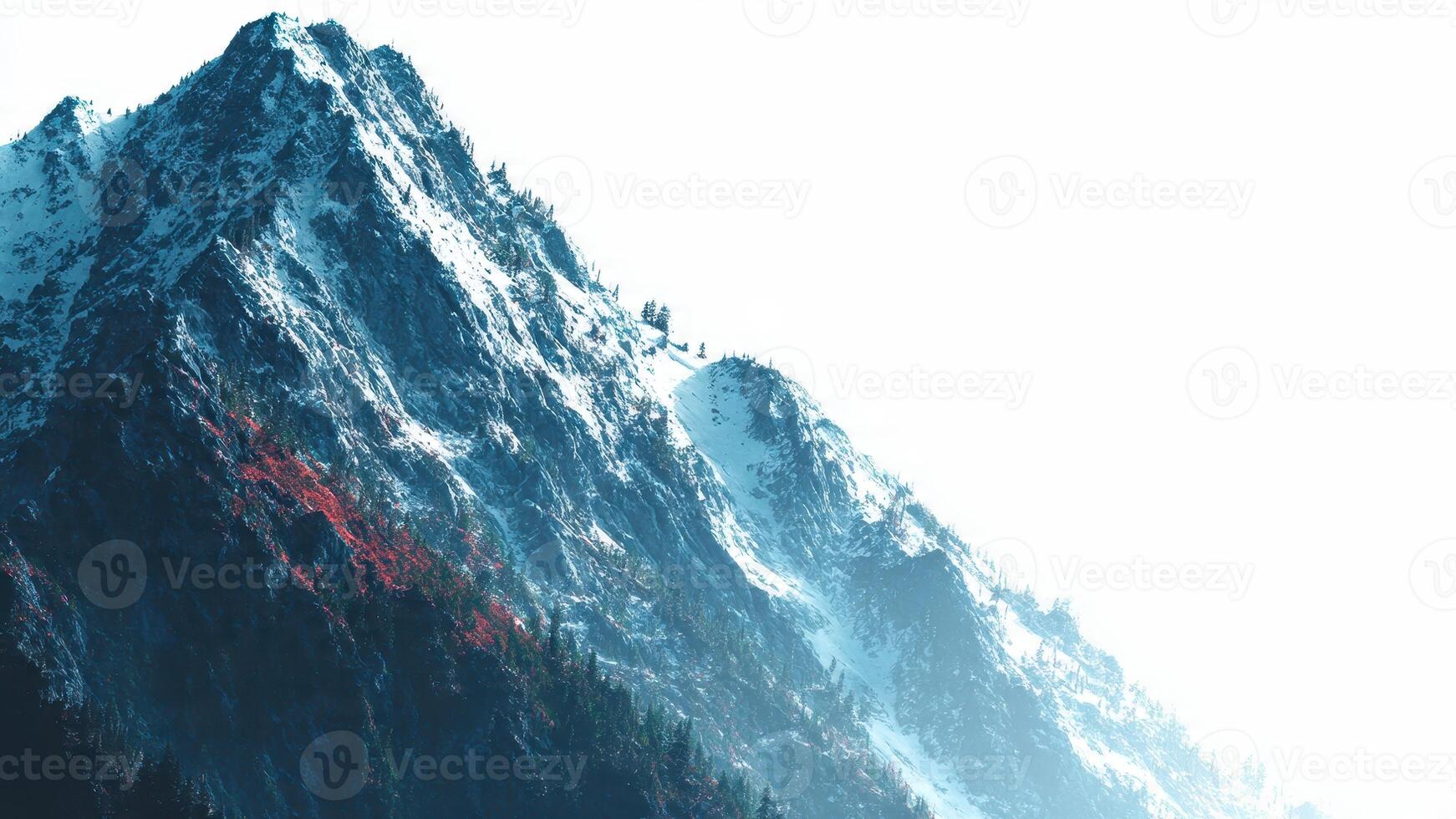 Snow capped mountain range with sparse trees and patches of red vegetation under a bright sky Pro Photo