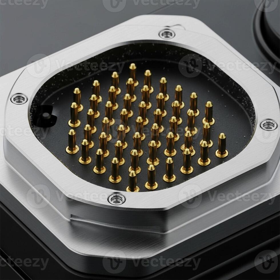 Close up of a high density electrical connector with numerous gold plated pins arranged in a hexagonal pattern within a robust housing Pro Photo