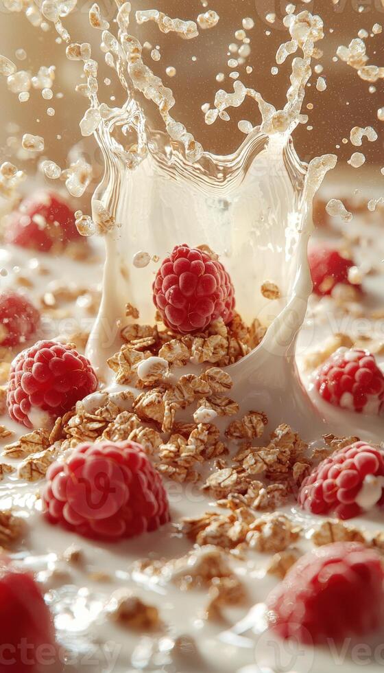 Fresh raspberries falling into a bowl of milk with granola, creating a splash effect, with scattered cereal pieces. Pro Photo