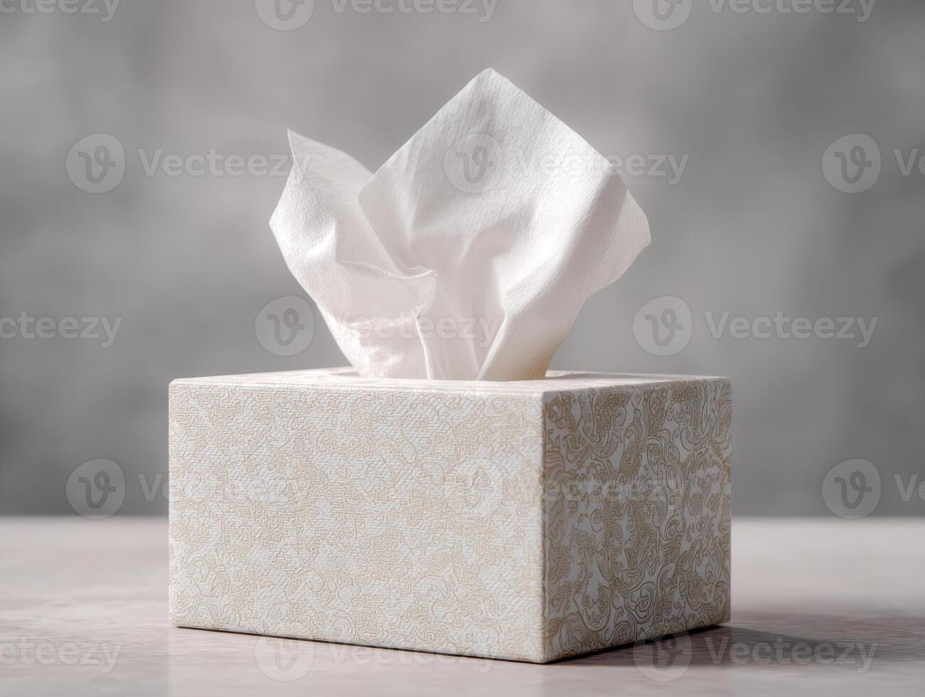 Soft white facial tissue emerging from an elegant patterned rectangular box placed on a smooth surface with a blurred neutral background for hygiene and skincare use Pro Photo