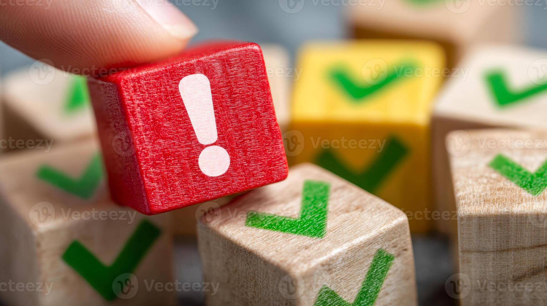A hand picking a red wooden block with an exclamation mark from a scattered group of natural and yellow blocks featuring green check marks symbolizing decision making and Pro Photo