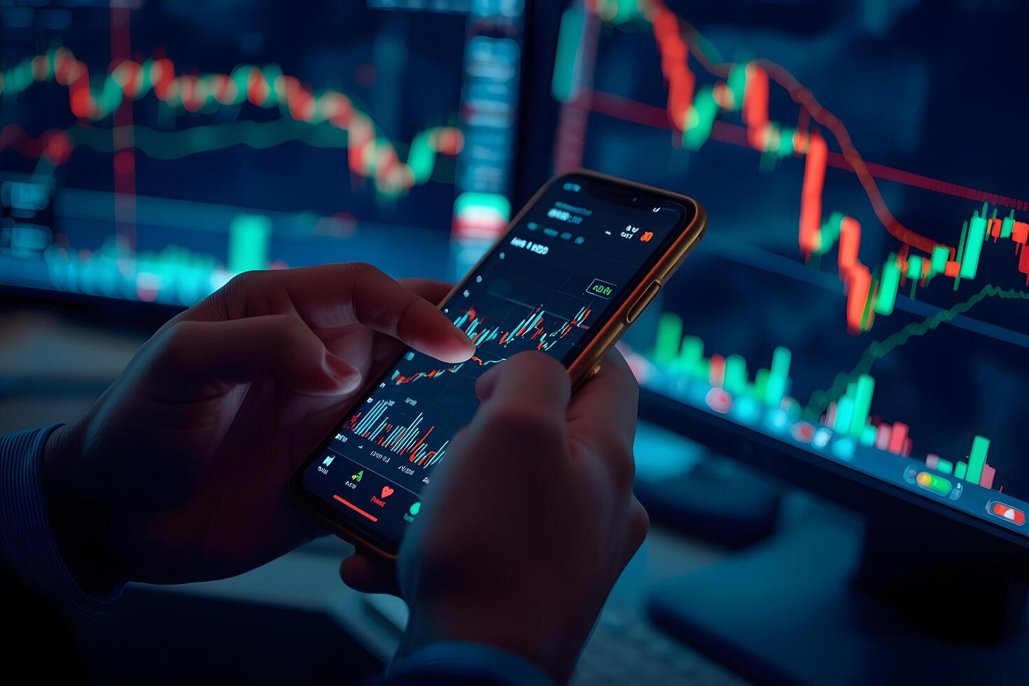 A person's hands holding a smartphone displaying stock market data, with multiple monitors in the background. photo