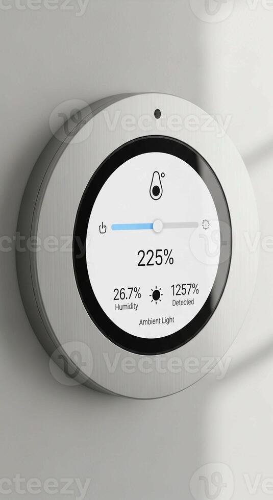 Modern smart home device displaying air quality readings and environmental data on a circular screen Pro Photo