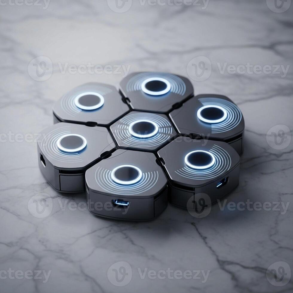 Hexagonal modular electronic devices with illuminated circular indicators arranged in a honeycomb pattern on a marbled surface Pro Photo
