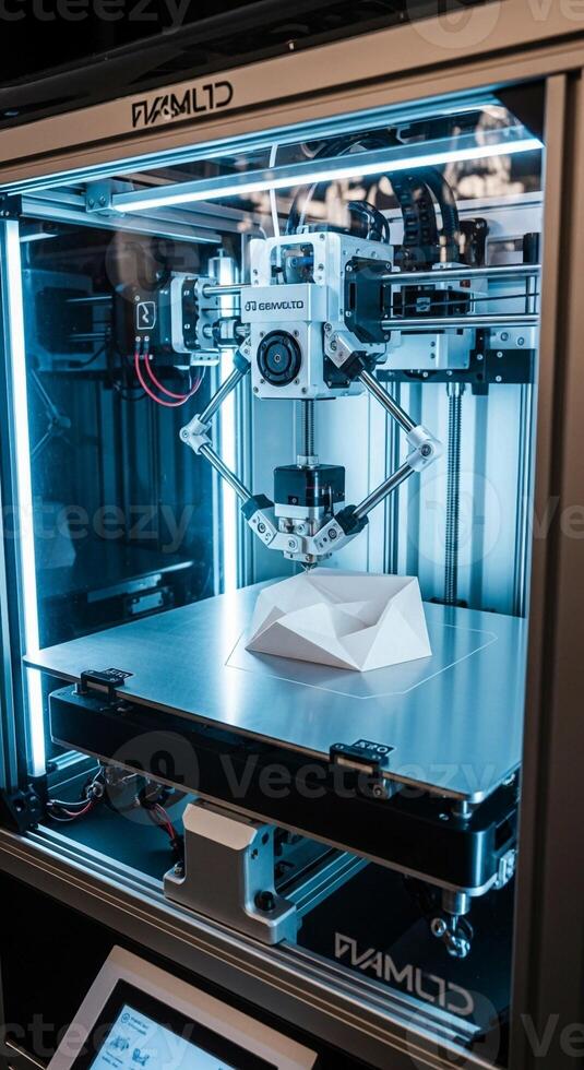 Advanced 3d printer in operation creating a white object on a heated build plate under blue lighting Pro Photo
