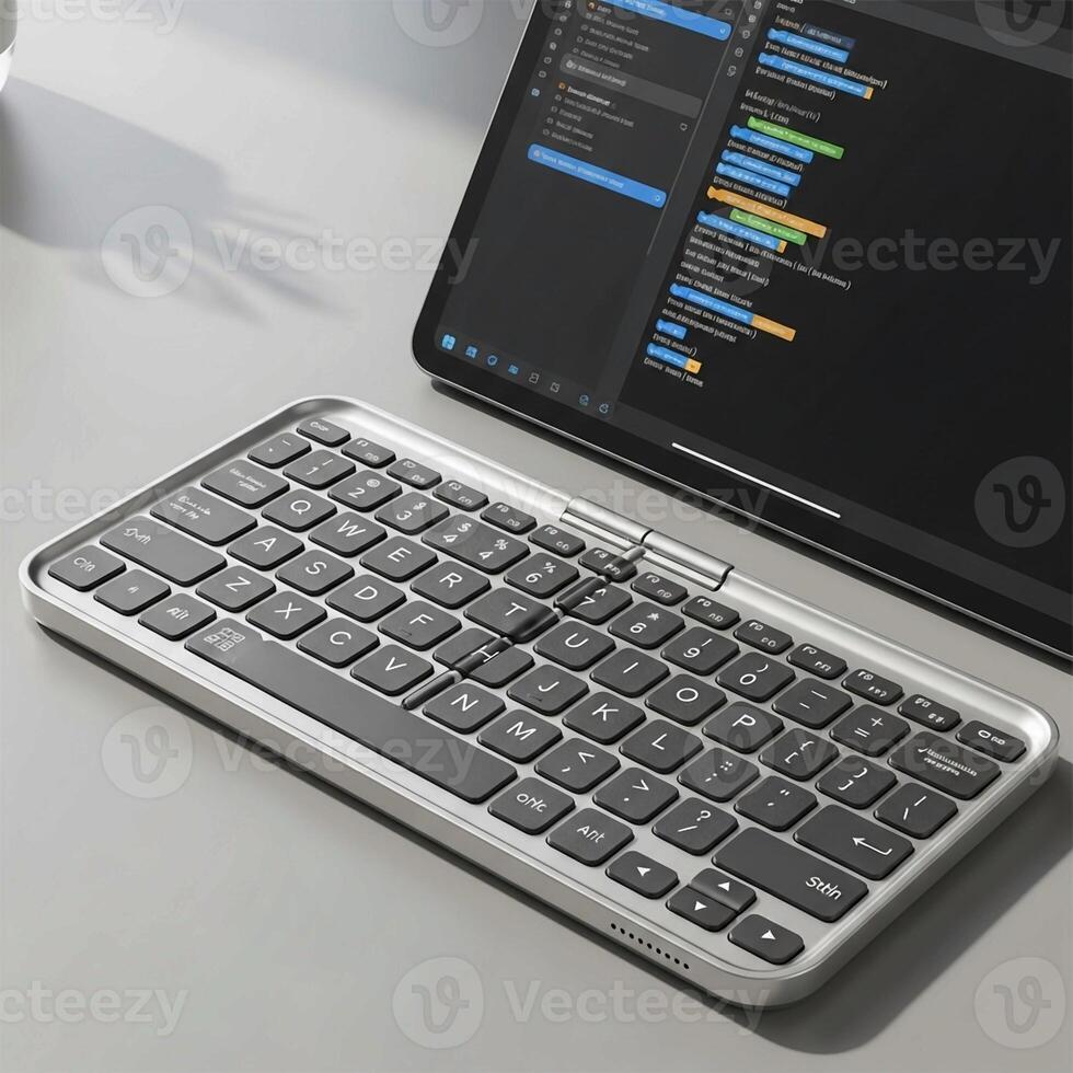Sleek silver wireless keyboard rests on a desk next to a tablet displaying code perfect for modern workspaces Pro Photo