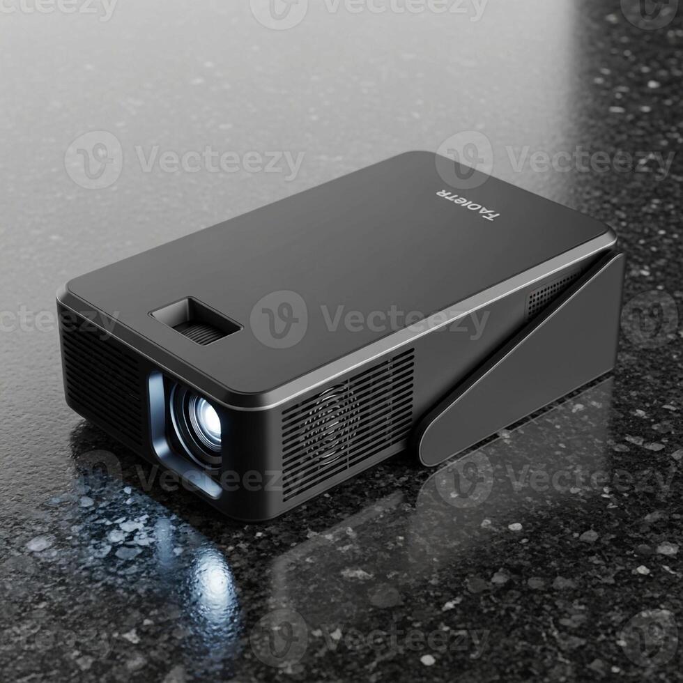 Compact black portable projector with built in stand resting on a speckled dark surface Pro Photo