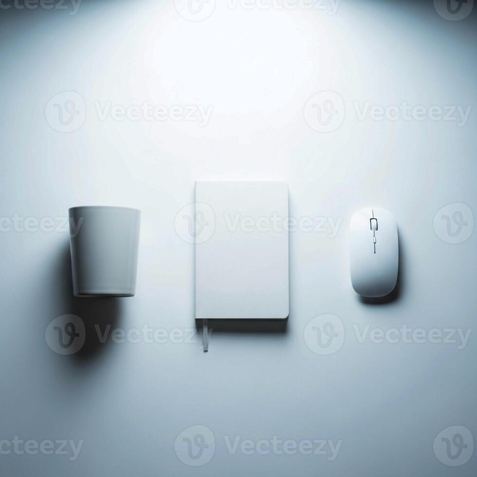 Minimalist desk setup featuring a white mug notebook and computer mouse on a clean white surface Pro Photo