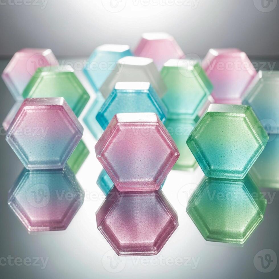 A collection of hexagonal shaped bottles with pastel color gradients displayed on a reflective surface Pro Photo
