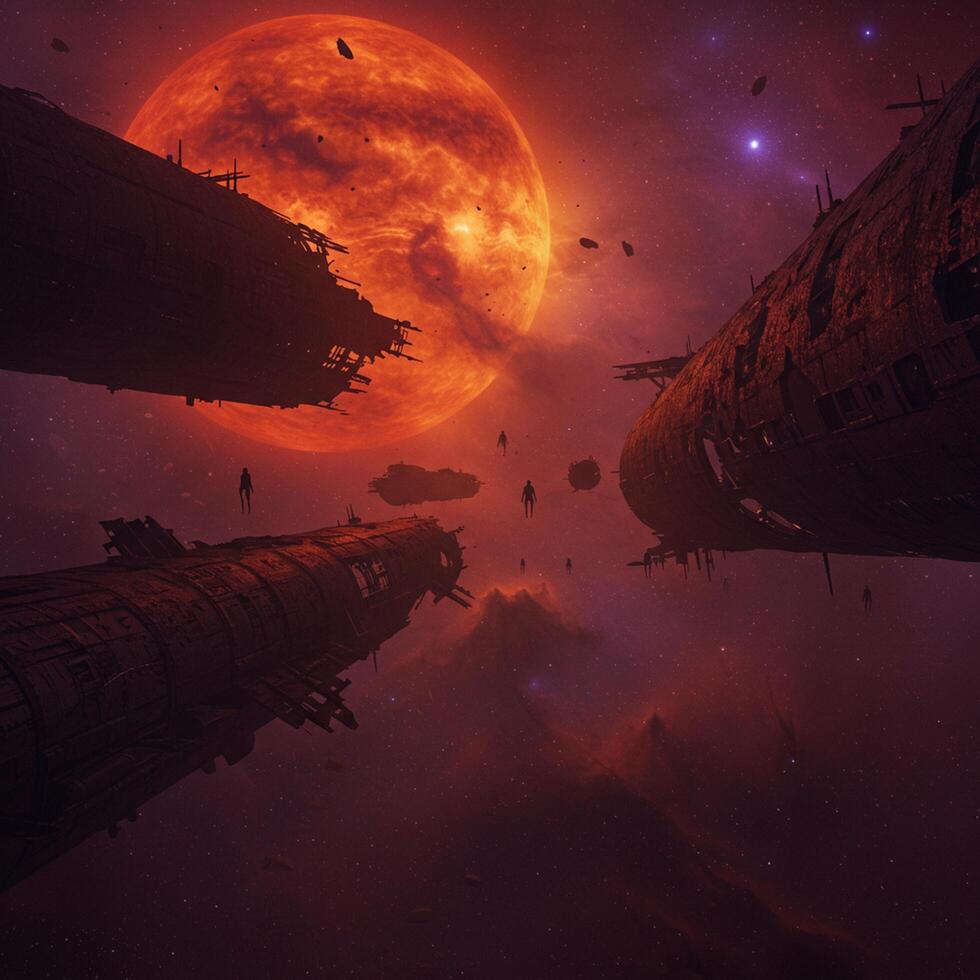 Floating Spaceships and Figures with a Red Planet in the Background photo