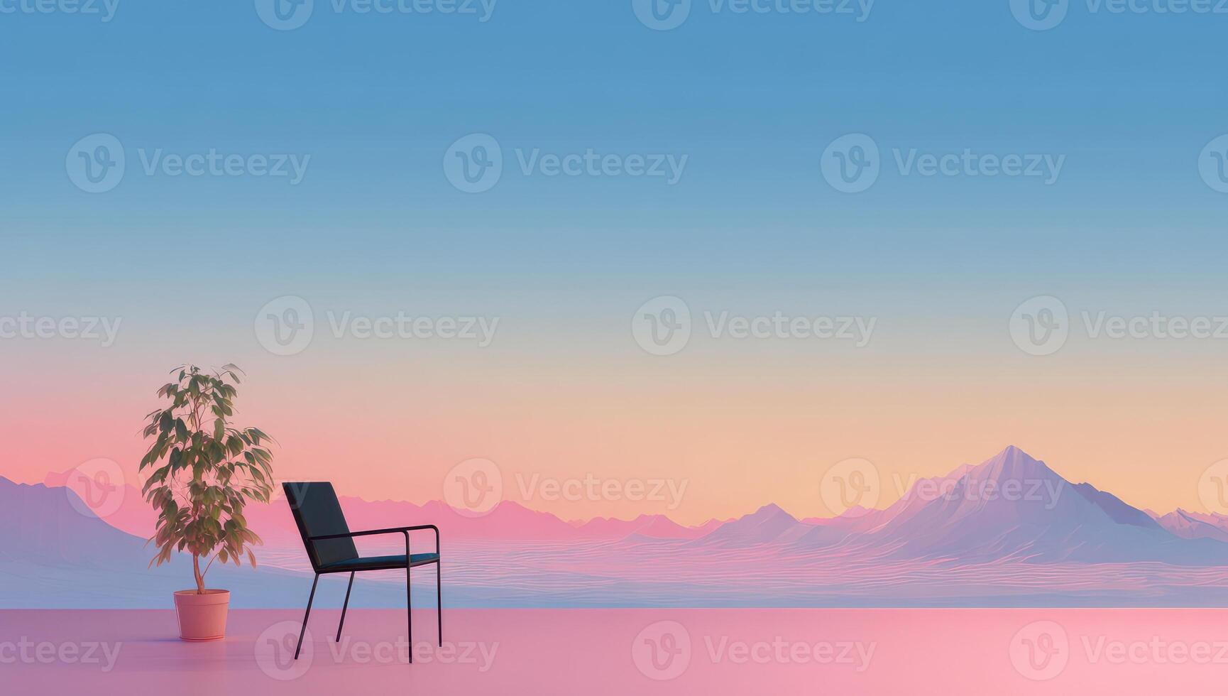 and keyword list based on the image, focusing on descriptive elements Chair and Plant Resting on Platform with Mountain View Pro Photo