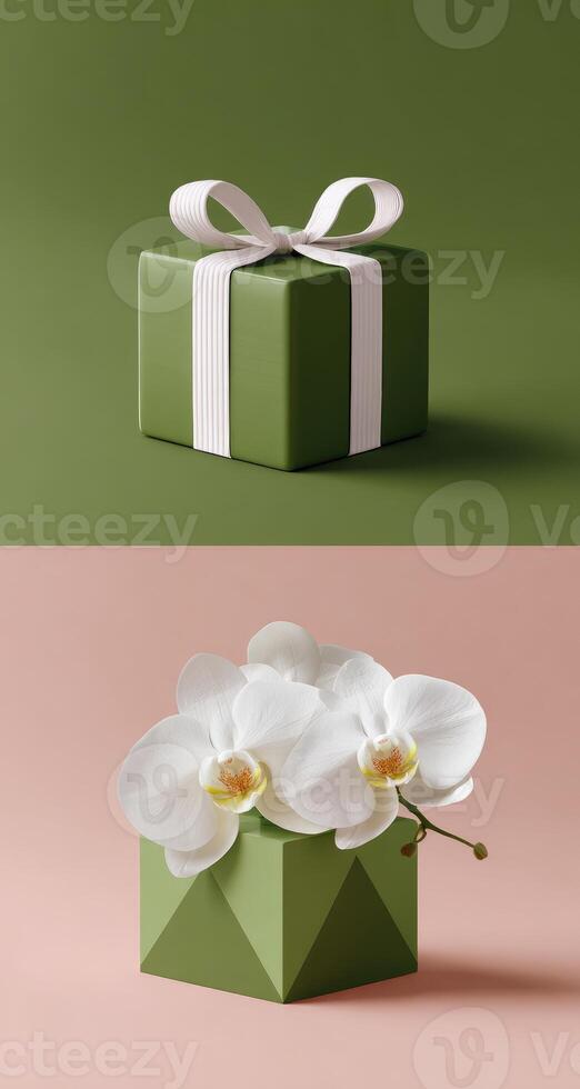 and keyword list based on the image Gift Box Still Life Styled Green Boxes Against Split-Tone Background. Pro Photo