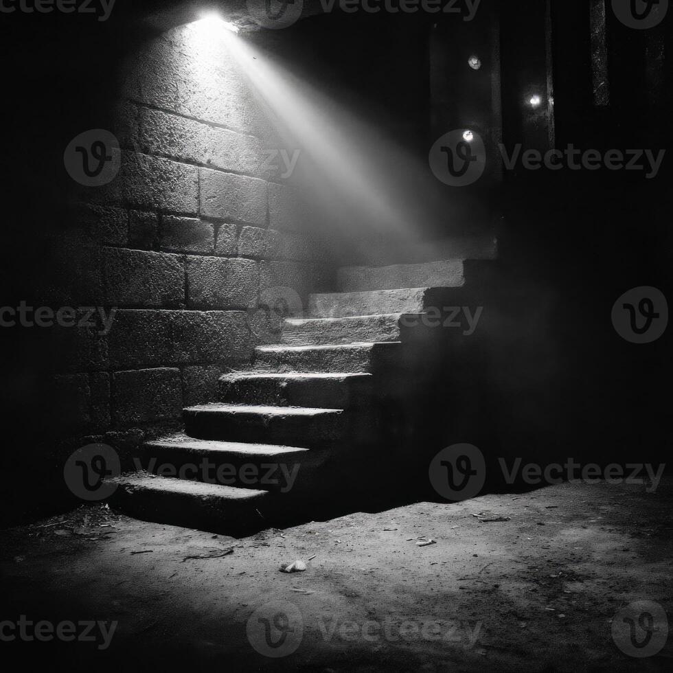 Stone steps descend into darkness, illuminated by a ray of light, creating a contrast of light and shadow. Pro Photo