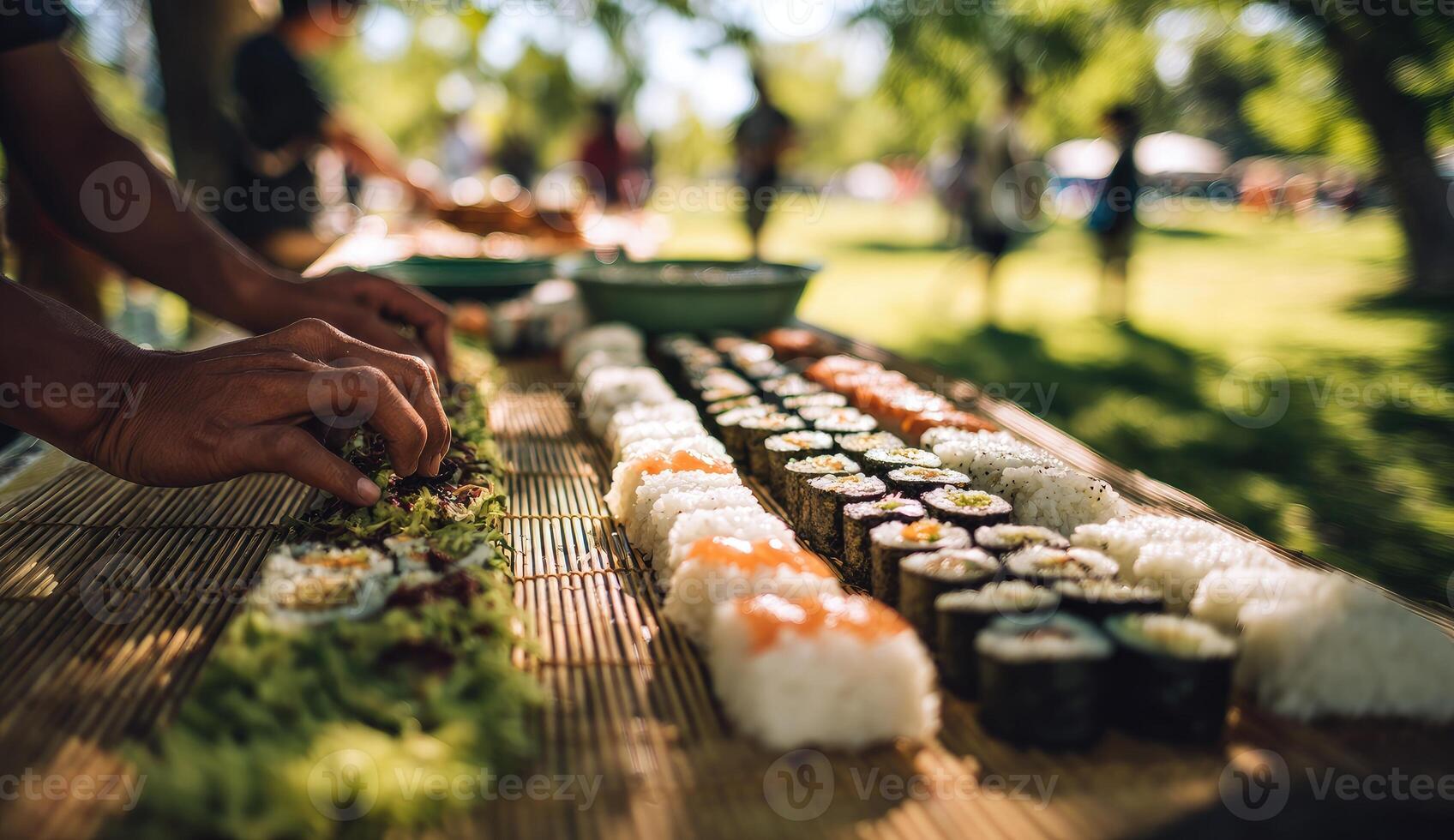Hands selecting sushi from a long buffet-style array outdoors Pro Photo