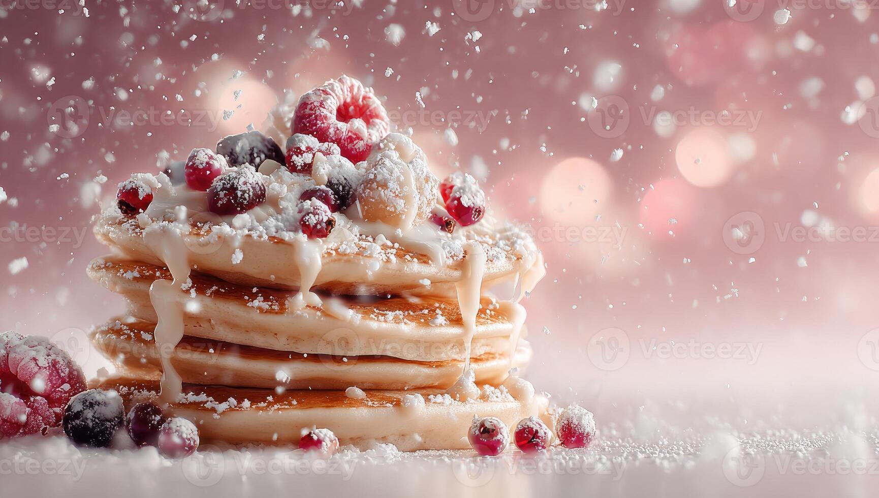 Stack of golden pancakes topped with fresh berries and powdered sugar, drizzled with syrup, against a blurred, bokeh background of festive pink, and snow-like particles Pro Photo