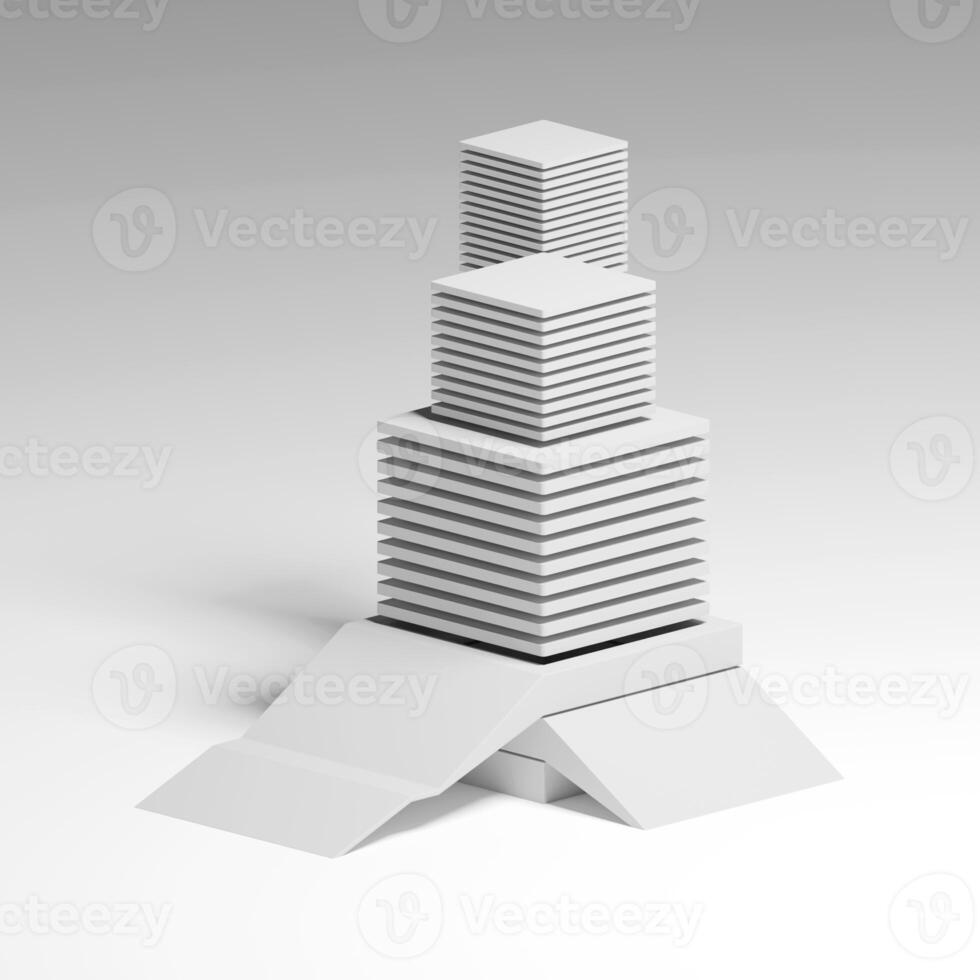 Futuristic Minimal Architecture Building Concept in White 3D Render. Modern Abstract Urban Tower with Geometric Shapes, Ramps, and Stairs for Future City Design Visualization. Minimal structure. 3d Pro Photo
