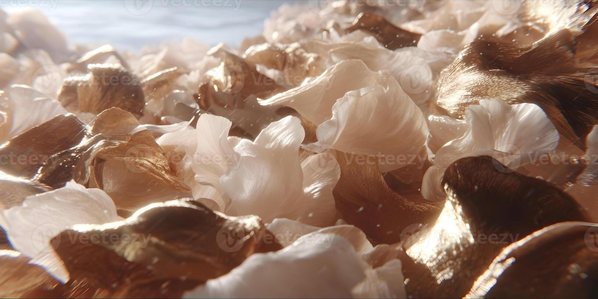 Golden and translucent delicate petal like shapes float in an abstract shimmering fluid background with sparkling particles Pro Photo