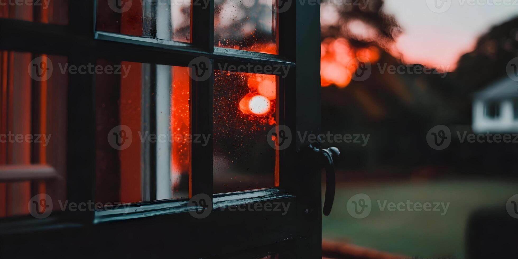 An open dark window frame capturing the moody evening light and blurred red bokeh from outside a cozy home Pro Photo
