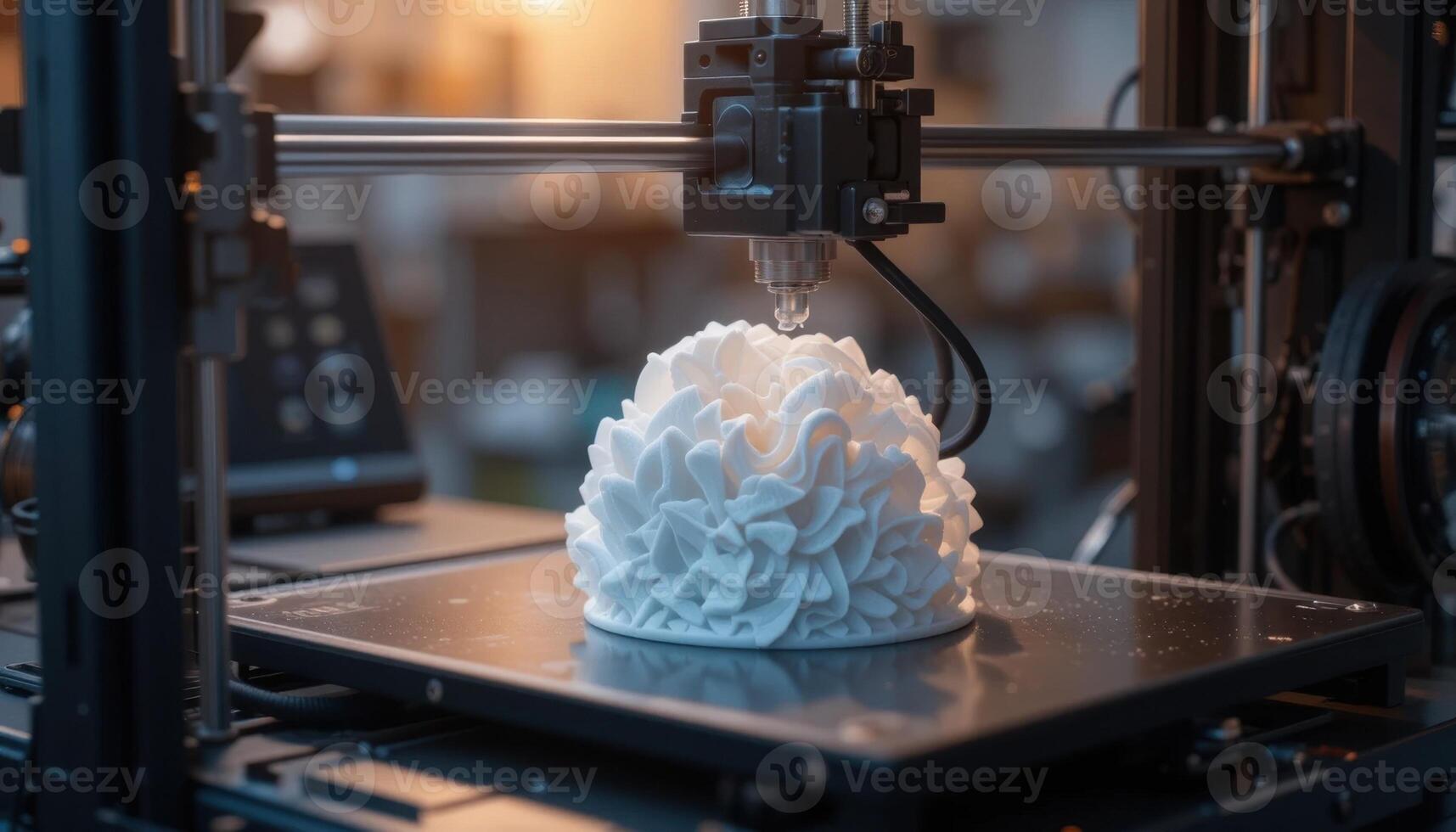 3D Printer Creating Intricate White Sculpture in Workshop During Afternoon Light Pro Photo