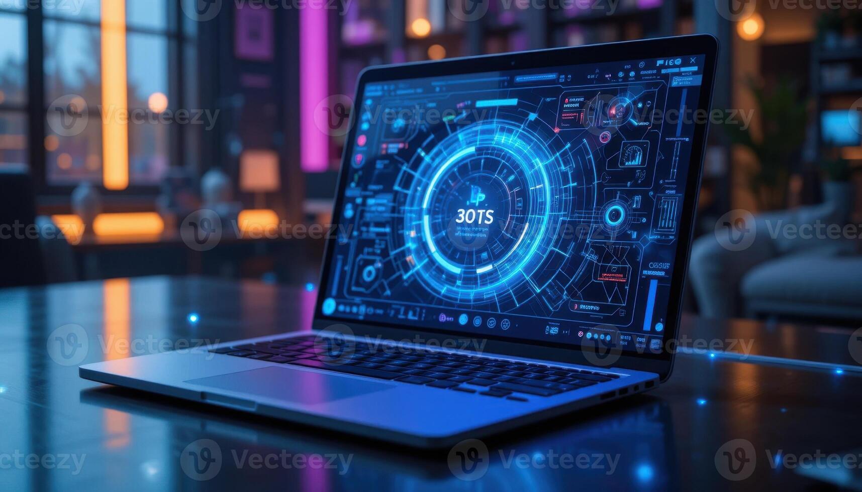 Futuristic Laptop Display Showing Data Analysis in a Modern Tech Environment Illuminated by Colorful Lights Pro Photo