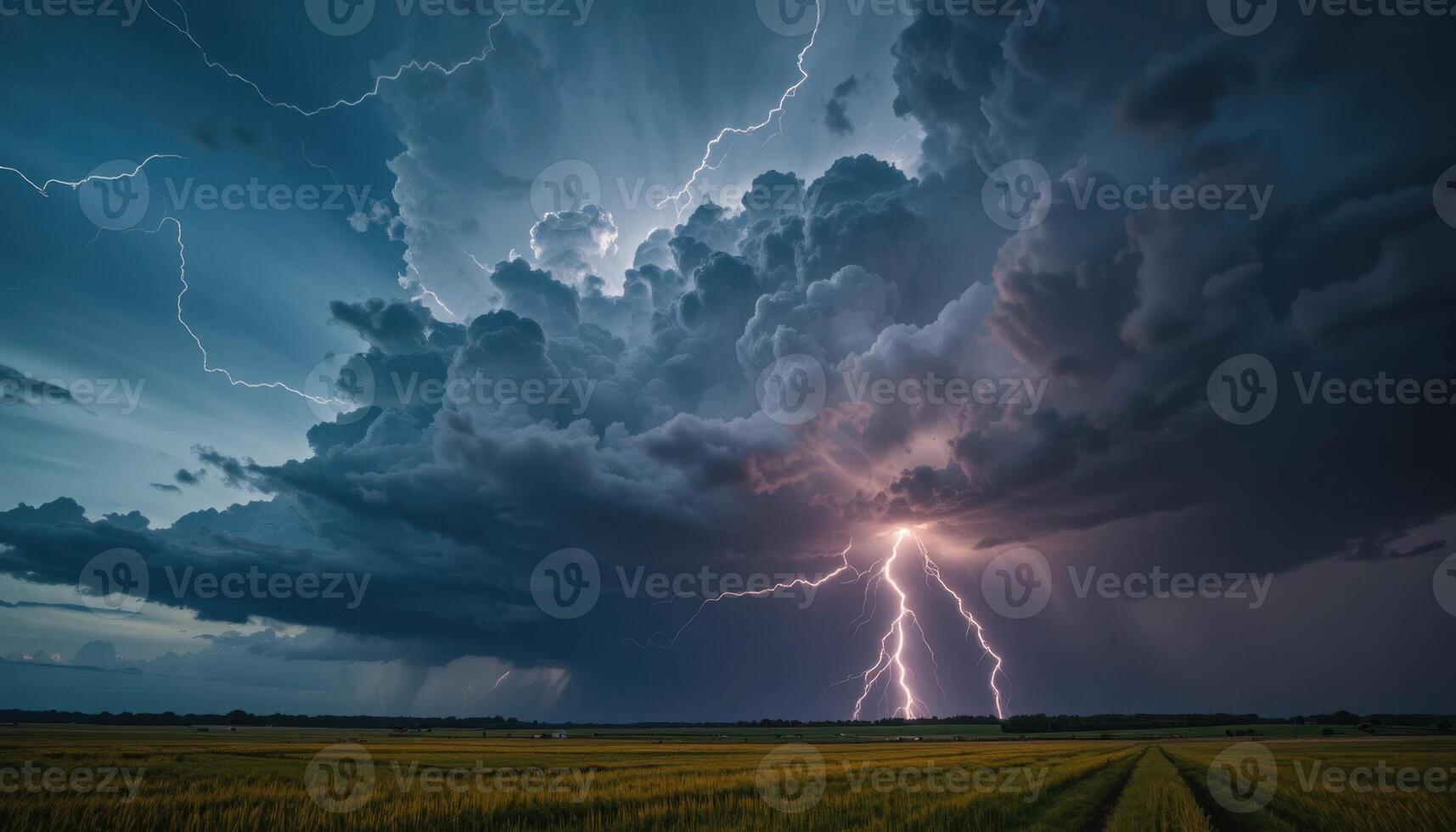 Intense Thunderstorm Unleashes Lightning Over Open Fields During Evening Hours Pro Photo