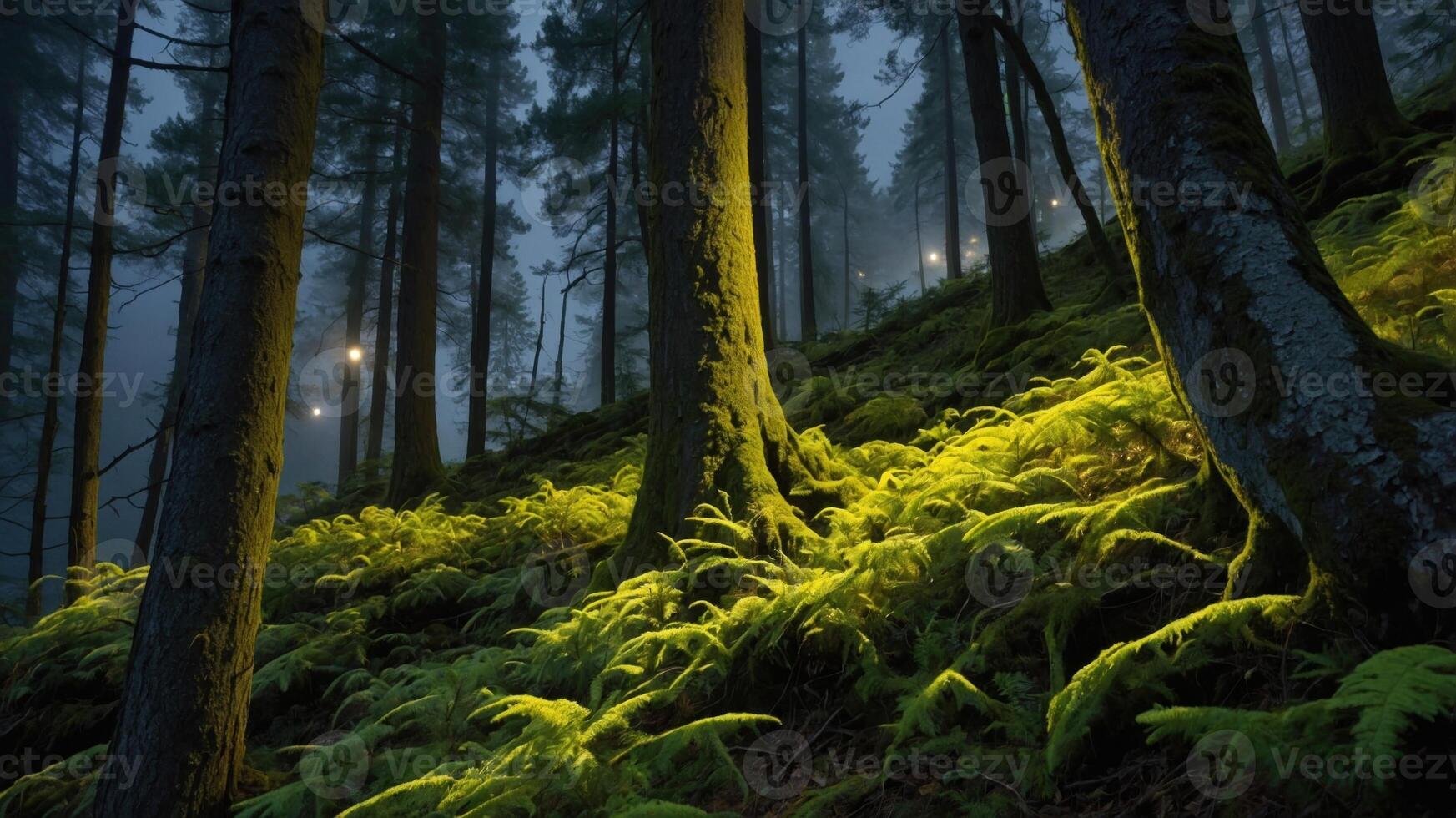 Enchanted forest at dusk with glowing ferns and soft mist, creating a serene and magical atmosphere Pro Photo