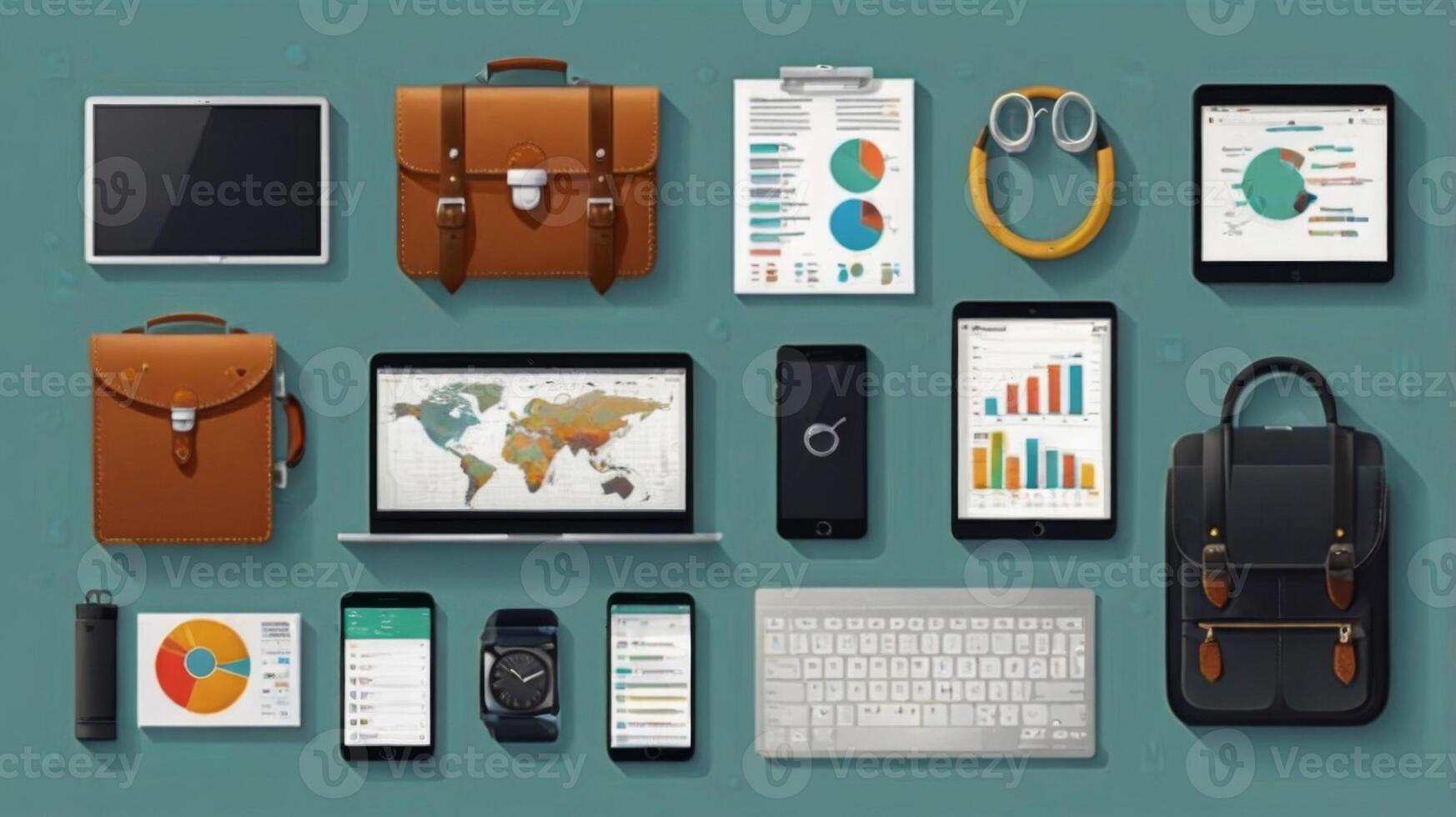 Modern workspace layout featuring various gadgets, bags, and data visualizations on a green backdrop for professional use Pro Photo